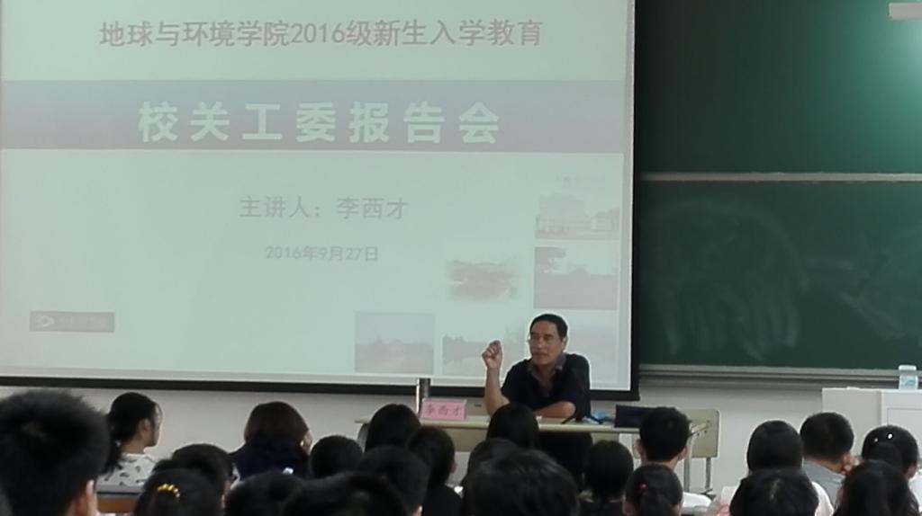 9月27日上午,校关工委常务副主任李西才在新校区天工楼201教室为汤姆影院 2016级新生作专题报告,深情寄语地环学子。汤姆影院 党委书记盛鹏飞主持报告会。