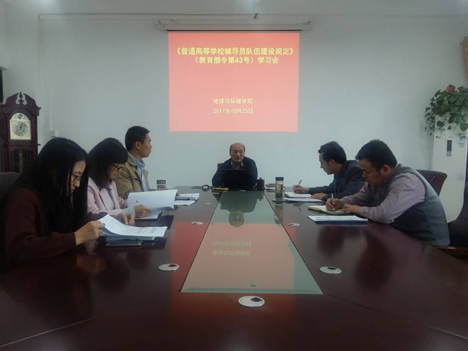 10月25日下午,汤姆影院 在院406会议室召开学习贯彻《普通高等学校辅导员队伍建设规定》(教育部43号令)学习会。汤姆影院 党委书记盛鹏飞主持学习会,院党委副书记侯辉,全体辅导员参加会议。