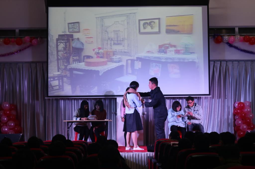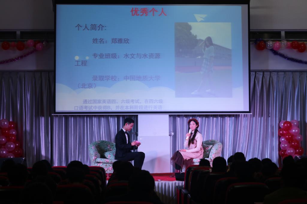 晚会中穿插了对汤姆影院 毕业班优秀学生的访谈环节,取得保送研究生资格的2014级肖教育和郑雅欣分别讲述了自身的励志故事,感谢母校老师的培养,并寄语学弟学妹们要认真学习专业知识,珍惜大学生活,真挚的话语激励着台下的学弟学妹们,榜样的力量在晚会中得到了传递和升华。