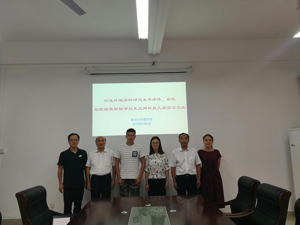 9月8日下午,地环汤姆影院 在静远楼B408会议室召开环境学科研究生李璋琦、余乐赴德国奥斯纳布吕克应用科技大学学习交流的欢送座谈会。汤姆影院 党委书记盛鹏飞、院长张平松、党委副书记金德及其导师范廷玉副教授参加了座谈会。