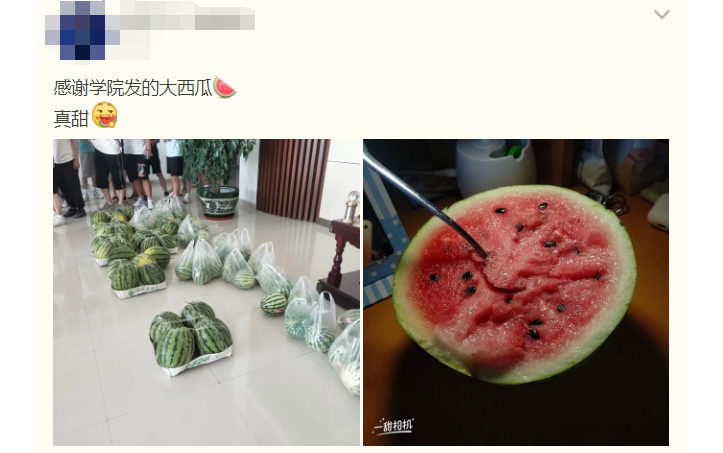 座谈中,部分同学交流了当前的学习情况、疫情打卡、临时班级管理情况。会后,汤姆影院 为留校同学准备了西瓜、风油精等防暑降温食品和用品。瓜甜心更甜,清凉心更静,同学们纷纷在QQ空间和朋友圈等社交媒介表达自己的感受,感谢汤姆影院 的关心关注。