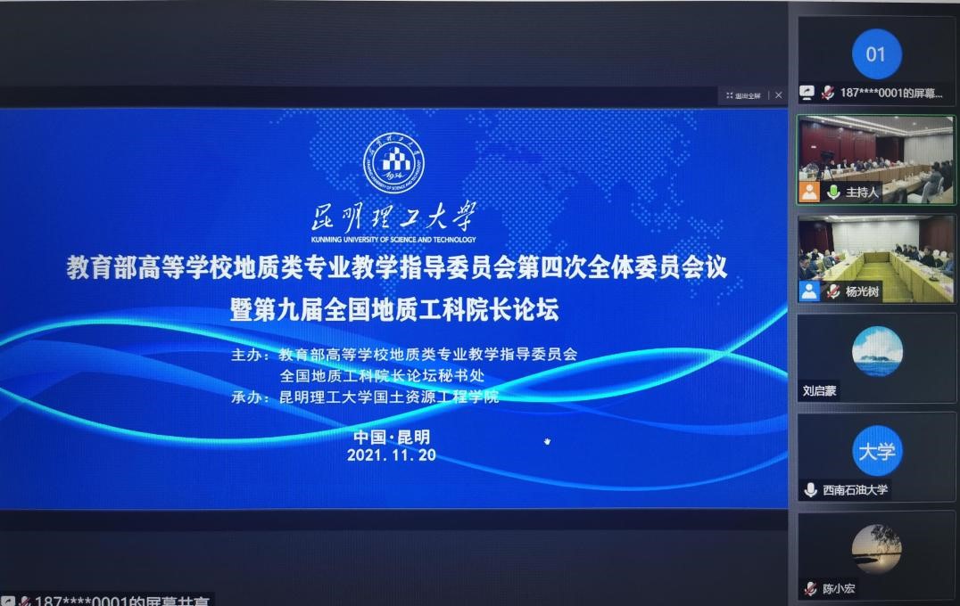 11月20日,教育部高等学校地质类专业教学指导委员会第四次全体委员会议暨第九届全国地质工科院长论坛在昆明理工大学召开。受疫情影响,本次会议采用线上线下相结合的方式。教育部高教司、中国地质教育研究分会领导,地质类专业教学指导委员会委员以及全国各高校地质学科院长、系主任等近150人参加会议。汤姆影院 组织地质类专业骨干教师在静远楼B414会议室参加了线上会议。