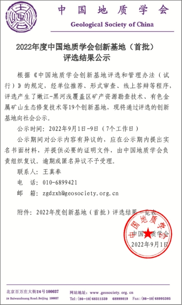 中国地质学会今年恰逢成立一百周年,作为中国科学技术协会主管的国家一级学会,挂靠单位为自然资源部。为深入贯彻落实国家创新驱动发展战略,提高地质科技创新能力,促进地质科技成果转化和示范应用,中国地质学会于今年6月开展了首批创新基地申报工作,旨在遴选出创新优势明显、特色鲜明的创新基地进行建设,旨在破解地学领域的重大科技难题,助力新时代地质工作创新发展,为国家经济社会高质量发展提供重要地质科技支撑。