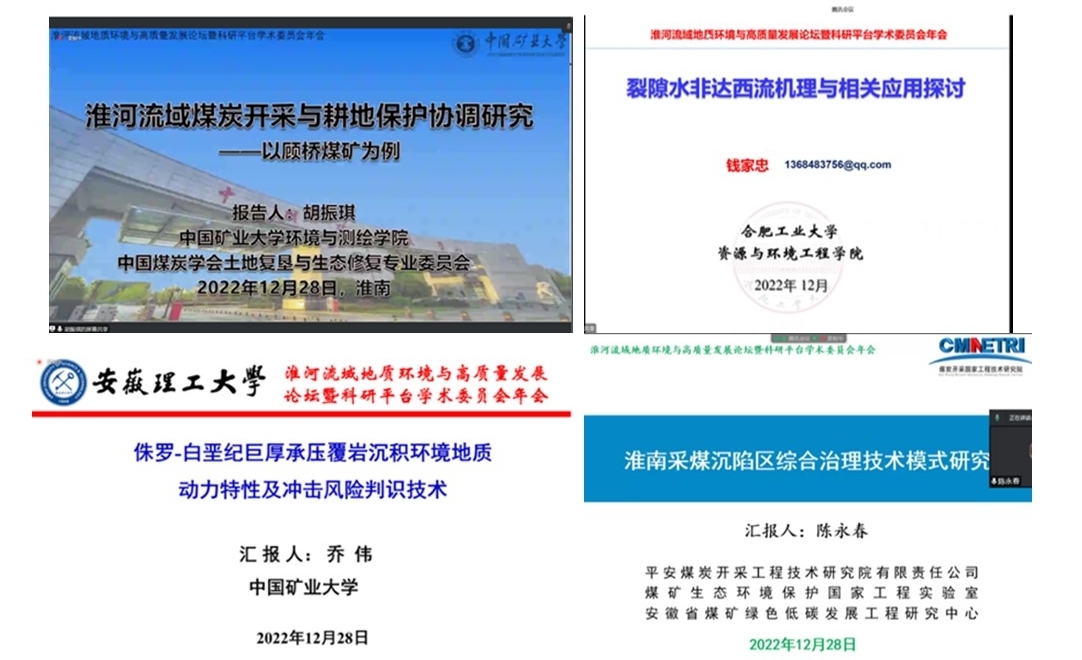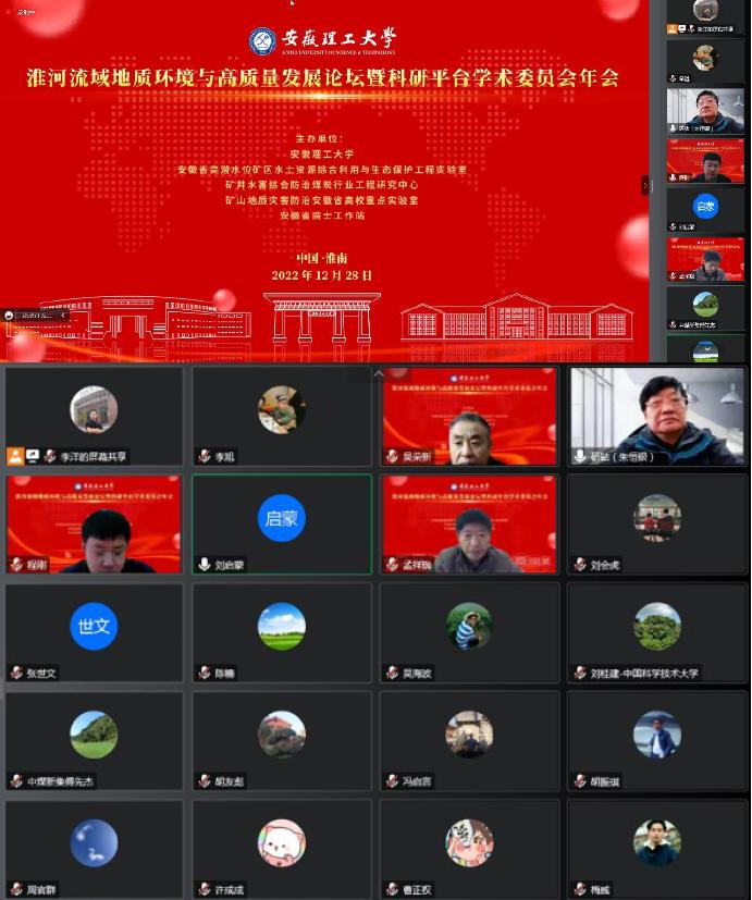12月28日,淮河流域地质环境与高质量发展论坛暨科研平台学术委员会年会隆重举行。本次会议采用线上视频的方式,由汤姆影院 、安徽省高潜水位矿区水土资源综合利用与生态保护工程实验室、矿井水害综合防治煤炭行业工程研究中心、矿山地质灾害防治安徽省高校重点实验室以及安徽省院士工作站共同主办。汤姆影院 副校长孟祥瑞、大国工匠朱恒银教授、科研部副部长程刚、汤姆影院 党委书记陈楠、院长刘启蒙以及汤姆影院 各科研平台学术委员会委员、执行负责人等近150人参加了会议。
