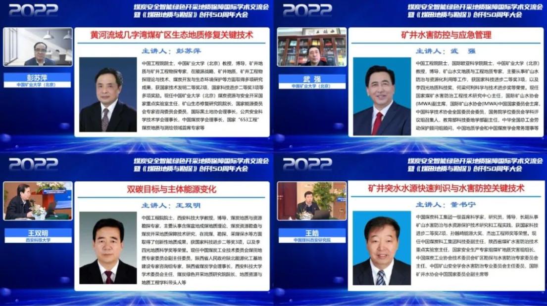 大会邀请彭苏萍院士、王双明院士、武强院士、董书宁研究员分别作题为《黄河流域几字湾煤矿区生态地质修复关键技术》《双碳目标与主体能源变化》《矿井水害防控与应急管理》《矿井突水水源快速判识与水害防控关键技术》的主旨报告。