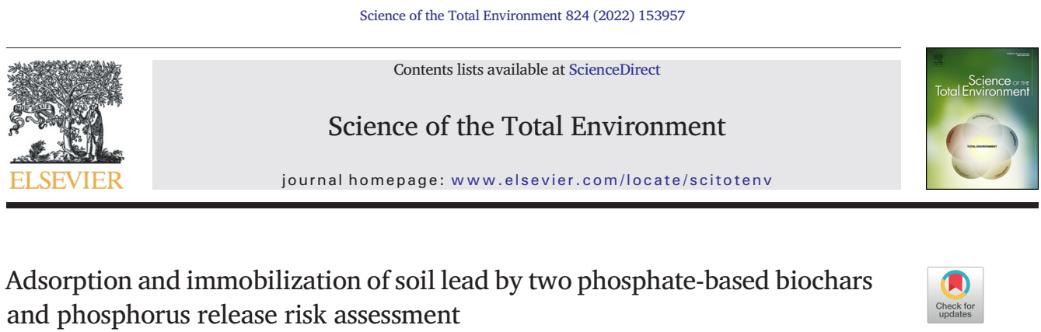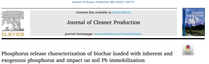 研究发现磷基生物炭对铅具有更好的固定效果,但是忽略了不同磷酸盐类型负载生物炭对铅吸附效果及其磷释放引起富营养化的风险。基于此,课题组以芦苇秸秆、磷酸二氢钾(可溶性)和羟基磷灰石(难溶性)改性芦苇秸秆为原料,制备三种生物炭研究其对铅的吸附及释磷风险。结果表明羟基磷灰石负载生物炭具有更高的铅吸附能力,且其磷释放风险较低(Cui et al., 2022, Science of the Total Environment, 824:153957)。进一步,课题组考察了外源溶解性磷负载生物炭以及含有一定含量内源磷的生物炭对铅吸附及磷释放风险,发现总磷含量一致的情况下,两种生物炭对铅具有相似的吸附能力,但是外源磷负载生物炭具有较高的磷释放风险(Baoet al., 2023, Journal of Cleaner Production, 400:136713)。