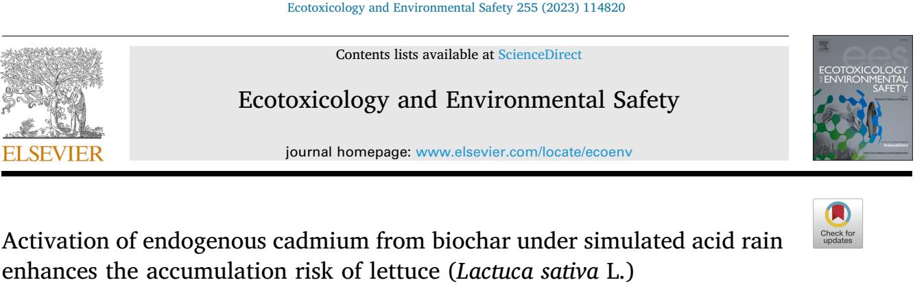 生物炭近年来在环境修复方面具有很好的应用,但是不同来源生物质制备的生物炭含有内源重金属含量差异显著,环境老化如干湿、冻融、酸雨等是否会活化生物炭内源重金属,增加潜在的环境风险,当前的研究鲜有报道。基于此,崔红标课题组采集了清洁区、中度和重度污染区巨菌草秸秆并制备生物炭,研究发现干湿和冻融老化促进生物炭内源重金属的活化(Cuiet al., 2021, Journal of Cleaner Production, 862:160690),且高含量内源镉生物炭应用土壤后,老化作用增加了土壤镉生物有效性,增加了生菜镉富集的环境风险(Cui et al., 2021, Science of the Total Environment, 862:160690;Cui et al., 2023, Ecotoxicology and Environmental Safety, 255:114820)。
