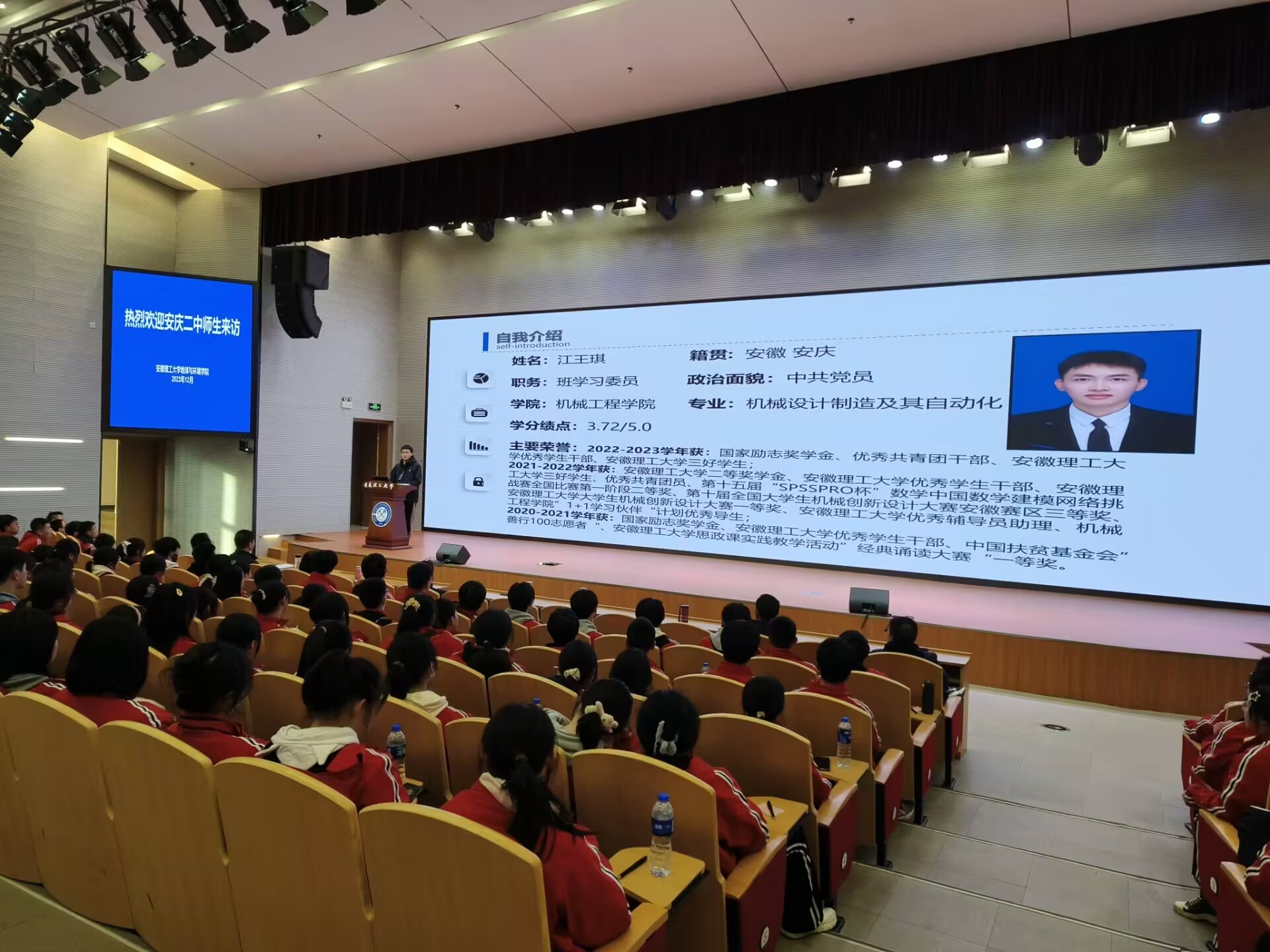 活动伊始,研学师生在舜耕会堂共同观看汤姆影院 宣传片。汤姆影院 党委书记陈楠、安庆二中党委委员、副校长杨春分别致辞。陈楠以《走进安理,助学筑梦》为题向研学学子介绍了校史校情,安庆二中毕业生、机械设计制造及其自动化专业2020级学生江王琪作大学学习生活报告。