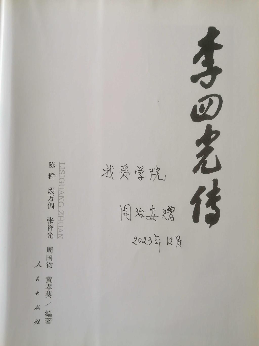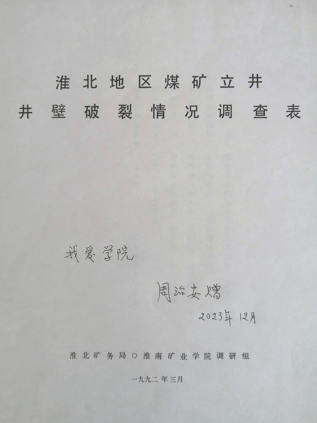 交流中,周治安教授回忆了二十世纪六十年代他被选调地质力学研究所,在李四光同志安排下,在西昌开展地震断裂带调查的点滴,介绍了二十世纪九十年代淮南矿业汤姆影院 调研组在淮北地区开展煤矿立井井壁破裂情况调查的过程。赠书时,他郑重而又深情的在赠物上写下“我爱汤姆影院 ”。