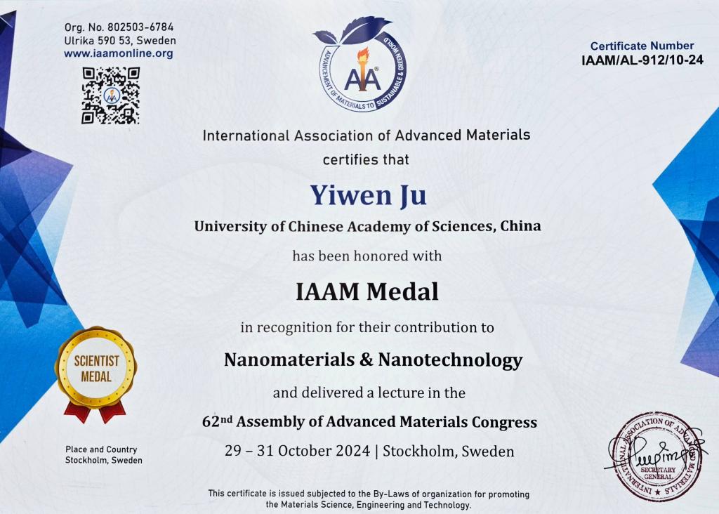 国际先进材料协会(IAAM)成立于2010年,总部设在瑞典,是一个致力于推动全球先进材料、工程和技术发展的非营利性国际学术组织,为先进材料科学、工程和技术在世界范围内快速发展提供一个高水平的学术平台。现已发展成为材料科学领域各类学科人才的聚集者和领导者,会员包括全球150余个国家的10万多名科学家。先进材料奖是由协会根据研究人员在先进材料领域所做的工作在世界范围内进行专家提名、学术委员会评选、学术演讲等环节遴选产生,最终授予在先进材料科学与技术领域做出重要贡献的研究人员,包括国际先进材料协会奖章(IAAM Medal)、国际先进材料协会科学家奖(IAAM Scientist Medal)和国际先进材料协会青年科学家奖(IAAM Young Scientist Medal)等。其中,国际先进材料协会奖章(IAAM Medal)是国际先进材料协会授予多个跨学科材料研究(物理、化学、生物学、工程、医学、大气、海洋、行星科学等)10年以上并对材料科学、工程与技术领域做出重大贡献的全球杰出研究人员和科学家的最高级别奖章。