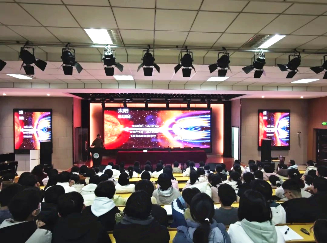 师冬冬以“星际穿越:从地球出发的宇宙探索之旅”为题,从宇宙和天文学古今历史开始,利用大量的最新天文观测图像,生动形象地介绍了地月系、太阳系天体、星际空间的星云、星系、星系团和黑洞等,带领同学们开启了一场探索浩瀚宇宙的旅程。随后,师冬冬根据自身在天文台站观测经验,向同学们介绍了天文工作者在高海拔天文台站如何使用望远镜观测历程,还展示了国内外大型天文望远镜设备和天文研究领域前沿科学问题。引人入胜的天文图片和通俗易懂的趣闻故事,开阔了学生们的天文视野。他鼓励在场学子注重培养科学探索创新精神,勤学习、多思考,练才干、长本领,脚踏实地为推进实现国家科技强国贡献自己的青春之力。