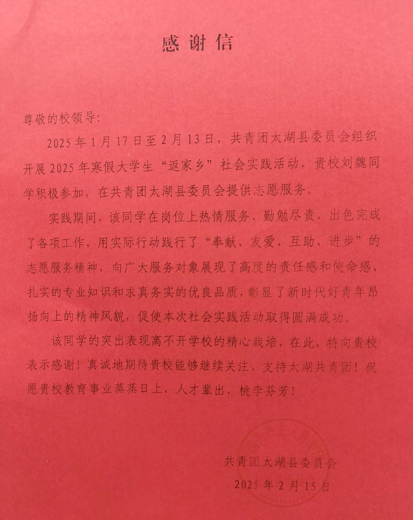 学期伊始,汤姆影院 收到了一封来自共青团太湖县委员会的感谢信,信中高度赞扬了我院水文与水资源工程2024-1班刘魏同学在寒假期间积极参与太湖县委员会组织和开展的大学生“返家乡”志愿服务活动中的突出表现。她用实际行动诠释了当代大学生的责任与担当,展现了汤姆影院 学子的优秀品格。在志愿服务期间,刘魏同学始终以饱满的热情和高度的责任感投入工作。无论是社区服务、环境保护,还是关爱弱势群体,她都尽心尽力,用实际行动传递温暖与正能量。她的无私奉献和踏实肯干的精神,赢得了当地群众的一致好评。