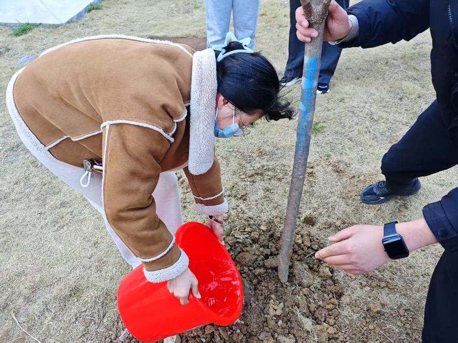 挥锹铲土、扶苗培根、提桶浇水……活动现场,毕业生党员们以班级为单位分工协作精心栽种。学生们种下玉兰,寓意高洁报国,这也是母校对毕业党员的殷切期许。地质学生第二党支部党员李轩窈轻抚树苗说道:“两年前在党旗下宣誓,今天以植树践行誓言。这棵树将带着我们的初心扎根母校,无论未来走多远,这里永远是精神原乡。”