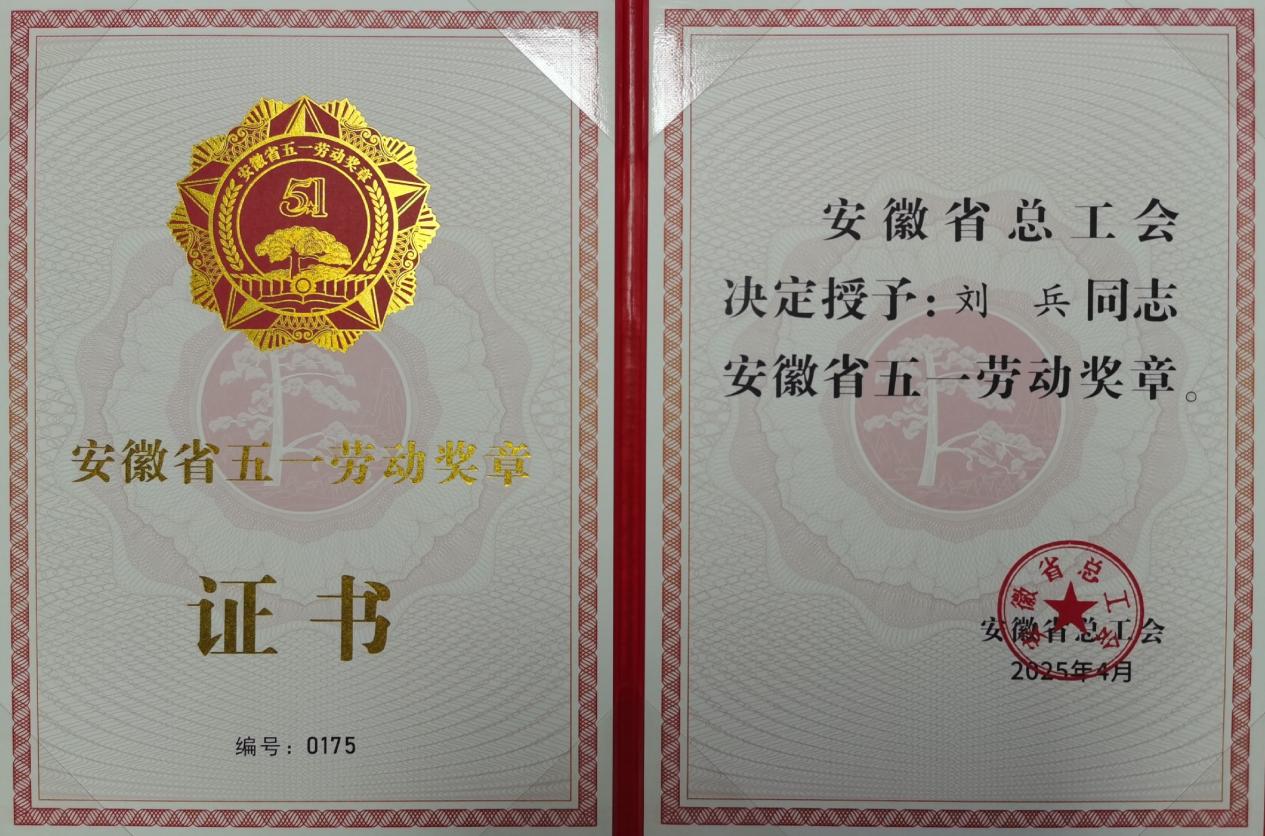 “安徽省五一劳动奖章”证书