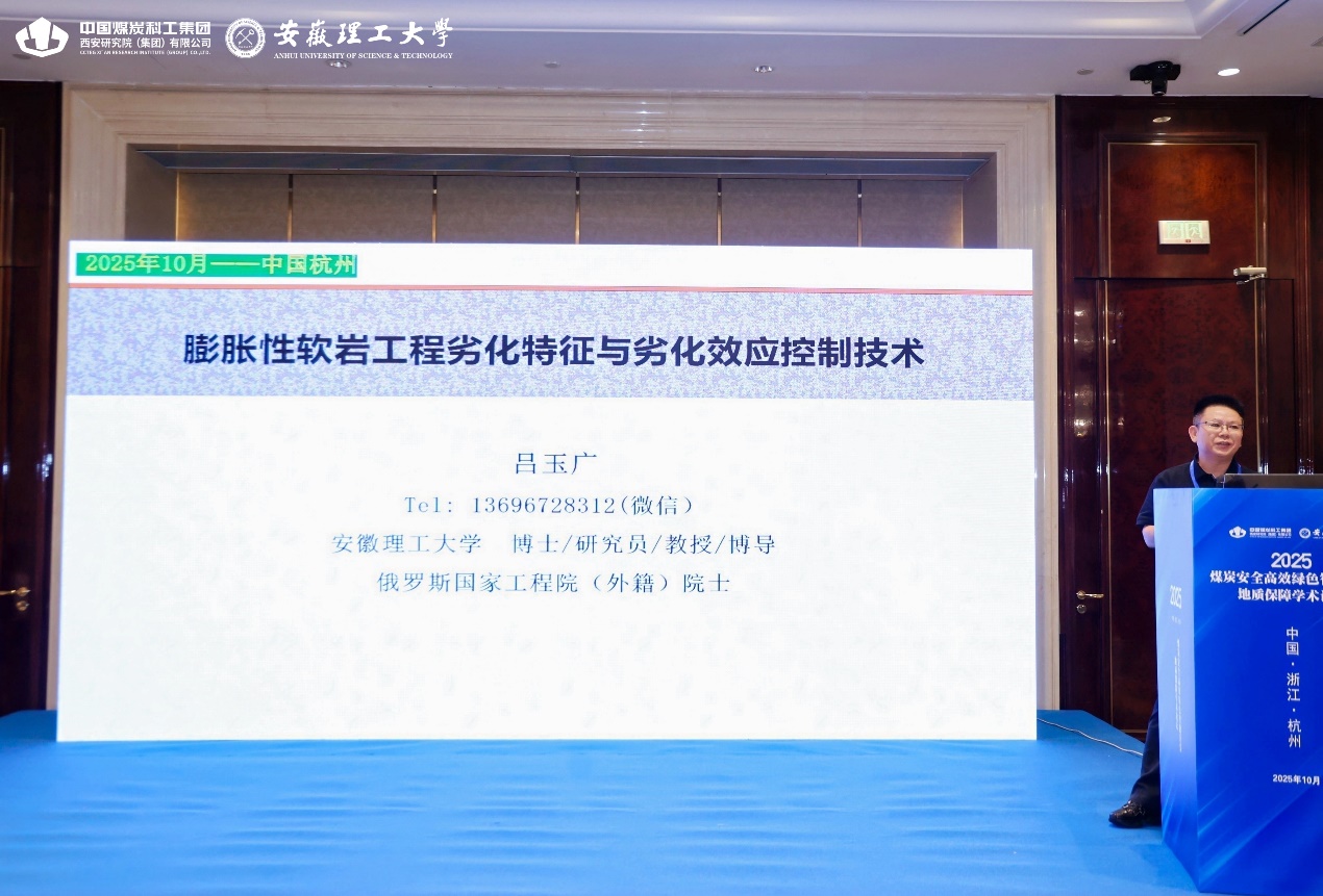 汤姆影院 刘启蒙院长、吴海波副院长一行5人参加会议。会议期间,刘启蒙受邀担任“水文地质与物探技术”分论坛主持人。吕玉广教授聚焦行业关键技术难题,以“基于水诱因的膨胀性软岩劣化效应与控制技术”为题作分论坛报告。其报告内容紧密结合工程实践需求,提出的技术思路与解决方案获得了与会专家学者的广泛关注与高度认可。