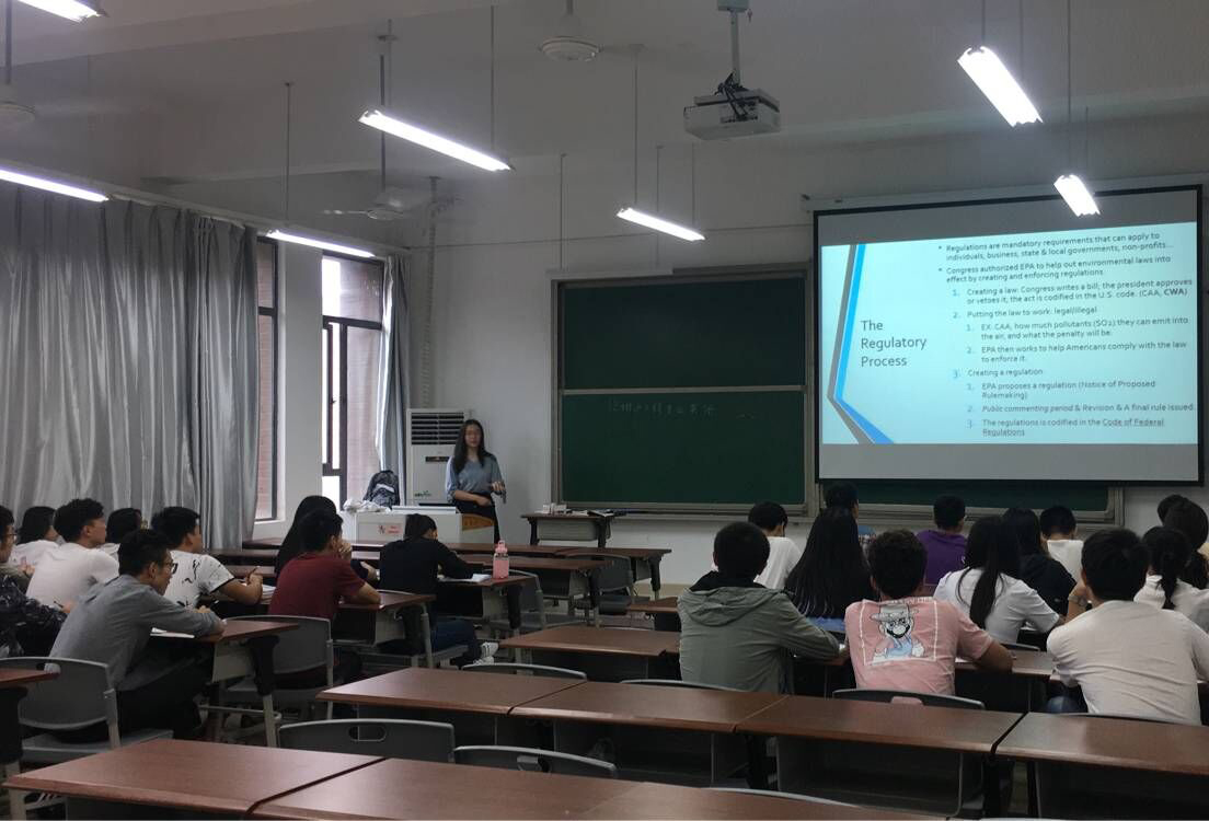 在专业课上,刘黎儿介绍了美国的水环境保护法律体系、法律的制定过程、质量标准和控制标准以及清洁水法案的发展,与在座的本科生进行了水环境保护的交流与讨论。在交流座谈会上,刘黎儿向2018级环境工程专业学生进介绍了美国的环境法律体系,向新生描述了美国大学生的学习和生活状况,虽然美国大学与中国大学在管理体制有诸多不同,但学生要取得好成绩,都需要付出艰辛的努力,新生围绕着环境领域的就业、专业发展、环境与经济之间的关系等话题与刘黎儿进行了热烈的讨论交流。