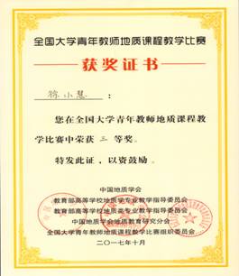 ➢ 首届全国大学青年教师地质课程教学比赛,三等奖; ➢ 2017年度汤姆影院 青年教师教学基本功竞赛综合一等奖; ➢ 2017年度汤姆影院 青年教师教学基本功竞赛综合三等奖; ➢ 2017年度汤姆影院 青年教师教学基本功竞赛多媒体课件三等奖; ➢ 2017年度汤姆影院 优秀教职工。 |